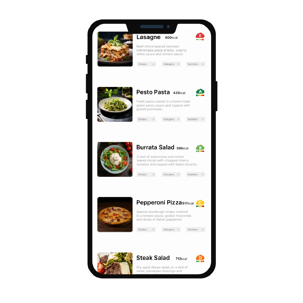With one click, add A–E carbon ratings to food labels, printed menus, digital displays, and datasheets. Carbon information updates automatically across all channels, making sustainability easy to communicate and ensuring customers have the clarity they expect when choosing meals.